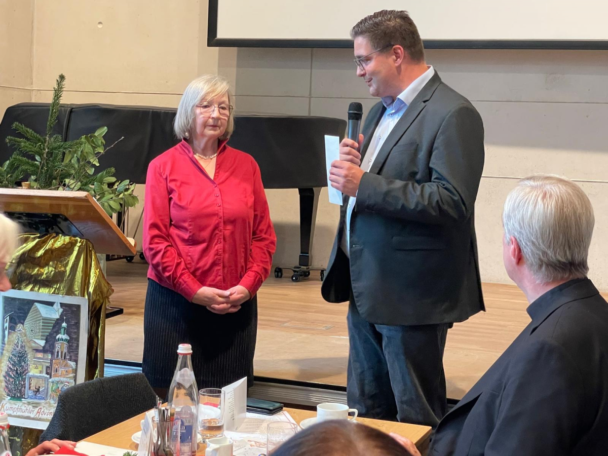 Der Frauen- und Mütterverein der Pfarrei St. Wolfgang verkauft seit Jahren liebevoll selbst gebastelte Geschenkartikel und Dekorationen auf seinen Basaren, um damit Gutes zu tun. Aus dem Erlös dieser Aktionen konnte der Verein in diesem Jahr 500 Euro für die Arbeit unseres Fördervereins Palliativmedizin am Universitätsklinikum Regensburg bereitstellen. Im Rahmen der stimmungsvollen Adventfeier mit Musik, besinnlichen Texten und gemeinsamen Liedern wurde die Spende von der Vorsitzenden Frau Reitmeier (li.) feierlich übergeben. Der Vorsitzende des Fördervereins Dr. Rechenmacher (re.) nahm die Spende persönlich entgegen und erläuterte dem zahlreich versammelten Publikum, wie mit solchen Beiträgen zusätzliche Angebote und Zeit für schwerstkranke Menschen ermöglicht werden. Wir bedanken uns sehr herzlich beim Frauen- und Mütterverein der Pfarrei St. Wolfgang für dieses wertvolle Zeichen der Verbundenheit und Unterstützung.